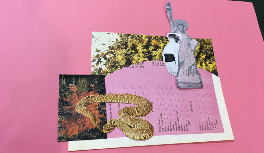 Através de possibilidades gráficas encontradas em diversas fontes, a colagem é uma apropriação e reinterpretação das inquietudes do artista. Através da fragmentação de fotografias, desenhos e palavras para a criação de uma imagem através da junção de diversos fragmentos.